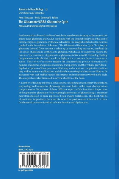 Introduction to the Glutamate-Glutamine cycle.- Glucose, lactate, beta-hydroxybutyrate, acetate, GABA, and succinate as substrates for synthesis of glutamate and GABA in the glutamine-glutamate/GABA cycle.- Anaplerosis for glutamate synthesis in the neonate and in adulthood.- Enzyme complexes important for the glutamate-glutamine cycle.- BCAA metabolism and NH3 homeostasis.- Glutaminases Vesicular Glutamate Uptake.- The glutamine transporters and their role in the Glutamate/GABA-Glutamine Cycle.- Glutamine Metabolism in Gliomas.- Oligodendrocytes: development, physiology and glucose metabolism.- Dysregulation of glutamate cycling mediates methylmercury-induced neurotoxicity.- Astroglia, glutamatergic transmission and psychiatric diseases.- Glutamine Synthetase: Role in Neurological Disorders.- The Glutamate - Glutamine Cycle in Epilepsy.- Index.