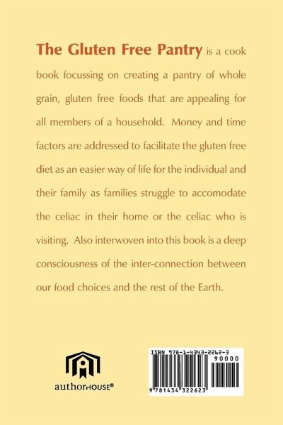 The Gluten Free Pantry is a cook book focussing on creating a pantry of whole grain, gluten free foods that are appealing for all members of a household. Money and time factors are addressed to facilitate the gluten free diet as an easier way of life for the individual and their family as families struggle to accomodate the celiac in their home or the celiac who is visiting. Also interwoven into this book is a deep consciousness of the inter-connection between our food choices and the rest of the Earth.
