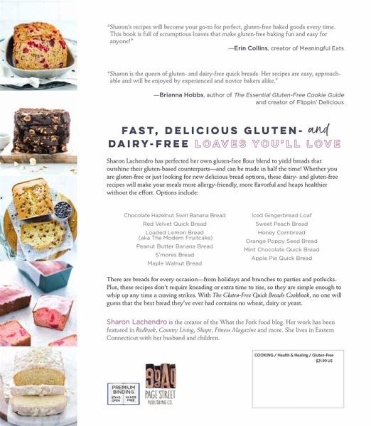 Fast, Delicious Gluten- and Dairy-Free Loaves You'll Love Sharon Lachendro has perfected her own gluten-free flour blend to yield breads that outshine their gluten-based counterparts-and can be made in half the time! Whether you are gluten-free or just looking for new delicious bread options, these dairy- and gluten-free recipes will make your meals more allergy-friendly, more flavorful and heaps healthier without the effort. Options include: Chocolate-Hazelnut Swirl Banana Bread Red Velvet Quick Bread Loaded Lemon Bread Peanut Butter Banana Bread S'mores Bread Maple Walnut Bread Iced Gingerbread Loaf Sweet Peach Bread Honey Cornbread Orange Poppy Seed Bread Mint Chocolate Quick Bread Apple Pie Quick Bread There are breads for every occasion-from holidays and brunches to parties and potlucks. Plus, these recipes don't require kneading or extra time to rise, so they are simple enough to whip up any time a craving strikes. With The Gluten-Free Quick Breads Cookbook, no one will guess that the best bread they've ever had contains no wheat, dairy or yeast.