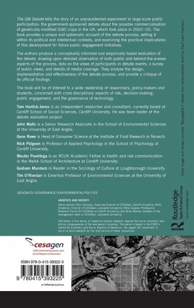 Tom Horlick-Jones is an independent researcher and consultant, currently based at Cardiff School of Social Sciences, Cardiff University. He was team leader of the debate evaluation project. John Walls is a Senior Research Associate in the School of Environmental sciences at the University of East Anglia. Gene Rowe is Head of Consumer Science at the Institute of Food Research in Norwich. Nick Pidgeon is Professor of Applied Psychology in the School of Psychology at Cardiff University. Wouter Poortinga is an RCUK Academic Fellow in health and risk communication in the Welsh School of Architecture at Cardiff University. Graham Murdock is Reader in the Sociology of Culture at Loughborough University. Tim O'Riordan is Emeritus Professor of Environmental Sciences at the University of East Anglia.