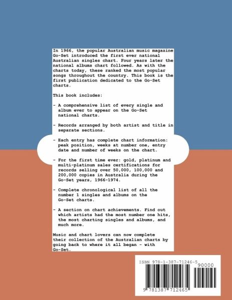 In 1966, the popular Australian music magazine Go-Set introduced the first ever national Australian singles chart. Four years later the national albums chart followed. This book is the first publication dedicated to the Go-Set charts. This book includes: - A comprehensive list of every single and album ever to appear on the Go-Set national charts. - Records arranged by both artist and title in separate sections. - Each entry has complete chart information: peak position, weeks at number one, entry date and number of weeks on the chart. - For the first time ever: gold, platinum and multi-platinum sales certifications for records selling over 50,000 copies. - Complete chronological list of all the number 1 singles and albums on the Go-Set charts. - Find out which artists had the most number one hits, the most charting singles and albums, and much more. Music and chart lovers can now complete their collection of the Australian charts by going back to where it all began - with Go-Set.