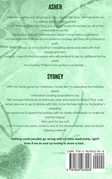 Asher After my mother was diagnosed with cancer last year, she has been on my siblings and I to get married. Afraid that her time is running out, she just wants to be here for all of the milestones in our life. I'm the last one left, the one who doesn't even have a girlfriend. My family knows that my life is invested in hockey, yet they still continue to push. I can't show up at my brother's wedding alone and deal with their disappointment. Instead, I need to find someone who will pretend to be my girlfriend for the week. And Sydney Phillips is the perfect candidate... Sydney With my family gone for Christmas, it looks like I'm spending the holidays alone. Until Asher Golding propositions me. We've been friends since freshman year and swore to keep it that way. Asher asks me to go to Maine with him, to be his fake date for his brother's wedding. He wants me to spend the holiday with his family afterwards, to make his mother happy. Who am I to say no? I don't have any plans, Asher is one of my closest friends, and we're just playing pretend. Nothing could possibly go wrong with our fake relationship, right? Even if we do end up having to share a bed...