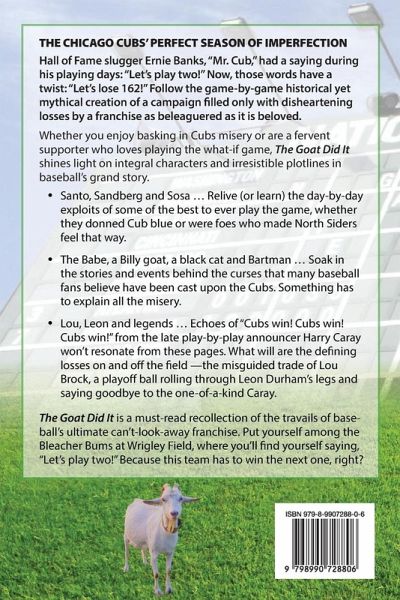 THE CHICAGO CUBS' PERFECT SEASON OF IMPERFECTION Hall of Fame slugger Ernie Banks, "Mr. Cub," had a saying during his playing days: "Let's play two!" Now, those words have a twist: "Let's lose 162!" Follow the game-by-game historical yet mythical creation of a campaign filled only with disheartening losses by a franchise as beleaguered as it is beloved. Whether you enjoy basking in Cubs misery or are a fervent supporter who loves playing the what-if game, The Goat Did It shines light on integral characters and irresistible plotlines in baseball's grand story.Santo, Sandberg and Sosa ... Relive (or learn) the day-by-day exploits of some of the best to ever play the game, whether they donned Cub blue or were foes who made North Siders feel that way. The Babe, a Billy goat, a black cat and Bartman ... Soak in the stories and events behind the curses that many baseball fans believe have been cast upon the Cubs. Something has to explain all the misery. Lou, Leon and legends ... Echoes of "Cubs win! Cubs win! Cubs win!" from the late play-by-play announcer Harry Caray won't resonate from these pages. What will are the defining losses on and off the field -the misguided trade of Lou Brock, a playoff ball rolling through Leon Durham's legs and saying goodbye to the one-of-a-kind Caray. The Goat Did It is a must-read recollection of the travails of baseball's ultimate can't-look-away franchise. Put yourself among the Bleacher Bums at Wrigley Field, where you'll find yourself saying, "Let's play two!" Because this team has to win the next one, right?