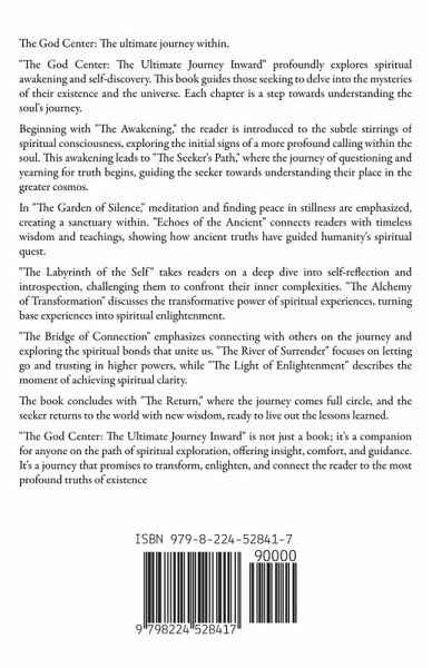 The God Center: The ultimate journey within. "The God Center: The Ultimate Journey Inward" profoundly explores spiritual awakening and self-discovery. This book guides those seeking to delve into the mysteries of their existence and the universe. Each chapter is a step towards understanding the soul's journey. Beginning with "The Awakening," the reader is introduced to the subtle stirrings of spiritual consciousness, exploring the initial signs of a more profound calling within the soul. This awakening leads to "The Seeker's Path," where the journey of questioning and yearning for truth begins, guiding the seeker towards understanding their place in the greater cosmos. In "The Garden of Silence," meditation and finding peace in stillness are emphasized, creating a sanctuary within. "Echoes of the Ancient" connects readers with timeless wisdom and teachings, showing how ancient truths have guided humanity's spiritual quest. "The Labyrinth of the Self" takes readers on a deep dive into self-reflection and introspection, challenging them to confront their inner complexities. "The Alchemy of Transformation" discusses the transformative power of spiritual experiences, turning base experiences into spiritual enlightenment. "The Bridge of Connection" emphasizes connecting with others on the journey and exploring the spiritual bonds that unite us. "The River of Surrender" focuses on letting go and trusting in higher powers, while "The Light of Enlightenment" describes the moment of achieving spiritual clarity. The book concludes with "The Return," where the journey comes full circle, and the seeker returns to the world with new wisdom, ready to live out the lessons learned. "The God Center: The Ultimate Journey Inward" is not just a book; it's a companion for anyone on the path of spiritual exploration, offering insight, comfort, and guidance. It's a journey that promises to transform, enlighten, and connect the reader to the most profound truths of existence