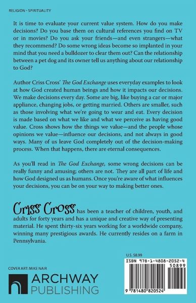 It is time to evaluate your current value system. How do you make decisions? Do you base them on cultural references you find on TV or in movies? Do you ask your friends-and even strangers-what they recommend? Do some wrong ideas become so implanted in your mind that you need a bulldozer to clear them out? Can the relationship between a pet dog and its owner tell us anything about our relationship to God? Author Criss Cross' The God Exchange uses everyday examples to look at how God created human beings and how it impacts our decisions. We make decisions every day. Some are big, like buying a car or major appliance, changing jobs, or getting married. Others are smaller, such as those involving what we're going to wear and eat. Every decision is made based on what we like and what we perceive as having good value. Cross shows how the things we value-and the people whose opinions we value-influence our decisions, and not always in good ways. Many of us leave God completely out of the decision-making process. When that happens, there are eternal consequences. As you'll read in The God Exchange, some wrong decisions can be really funny and amusing; others are not. They are all part of life and how God designed us as humans. Once you're aware of what influences your decisions, you can be on your way to making better ones.