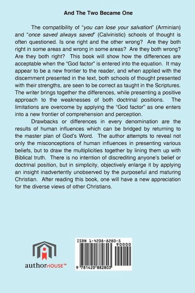 And The Two Became One The compatibility of "you can lose your salvation" (Arminian) and "once saved always saved" (Calvinistic) schools of thought is often questioned. Is one right and the other wrong? Are they both right in some areas and wrong in some areas? Are they both wrong? Are they both right? This book will show how the differences are acceptable when the "God factor" is entered into the equation. It may appear to be a new frontier to the reader, and when applied with the discernment presented in the text, both schools of thought presented with their strengths, are seen to be correct as taught in the Scriptures. The writer brings together the differences, while presenting a positive approach to the weaknesses of both doctrinal positions. The limitations are overcome by applying the "God factor" as one enters into a new frontier of comprehension and perception. Drawbacks or differences in every denomination are the results of human influences which can be bridged by returning to the master plan of God's Word. The author attempts to reveal not only the misconceptions of human influences in presenting various beliefs, but to draw the multiplicities together by lining them up with Biblical truth. There is no intention of discrediting anyone's belief or doctrinal position, but in simplicity, objectively enlarge it by applying an insight inadvertently unobserved by the purposeful and maturing Christian. After reading this book, one will have a new appreciation for the diverse views of other Christians.