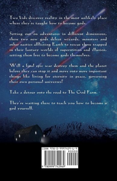 There's only one way to escape the graveyard planet called Earth... to become beyond human. Two kids discover reality in the most unlikely place where they're taught how to become gods. Setting out on adventures in different dimensions, these two new gods defeat wizards, monsters and other nasties afflicting Earth to rescue those trapped in their fantasy worlds of superstition and illusion, setting them free to become gods themselves. Will a final epic war destroy them and the planet before they can stop it and move onto more important things... like living for eternity in peace, governing their own personal universes? Take a detour onto the road to The God Farm. They're waiting there to teach you how to become a god yourself. If you like J.R.R. Tolkien's The Lord of the Rings, C.S. Lewis' Narnia and William Young's The Shack, then you won't be able to put down the riveting adventures of these heroic God Operators.