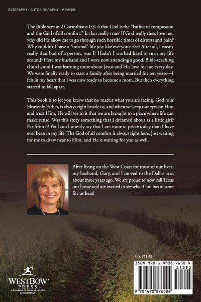 The Bible says in 2 Corinthians 1:3-4 that God is the "Father of compassion and the God of all comfort." Is that really true? If God really does love me, why did He allow me to go through such horrible times of distress and pain? Why couldn't I have a "normal" life just like everyone else? After all, I wasn't really that bad of a person, was I? Hadn't I worked hard to turn my life around? Here my husband and I were now attending a good, Bible-teaching church, and I was learning more about Jesus and His love for me every day. We were finally ready to start a family after being married for ten years-I felt in my heart that I was now ready to become a mom. But then everything started to fall apart. This book is to let you know that no matter what you are facing, God, our Heavenly Father, is always right beside us, and when we keep our eyes on Him and trust Him, He will see to it that we are brought to a place where life can make sense. Was this story something that I dreamed about as a little girl? Far from it! Yet I can honestly say that I am more at peace today than I have ever been in my life. The God of all comfort is always right here, just waiting for me to draw near to Him, and He is waiting for you as well.