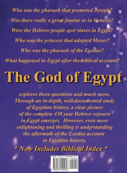 Did the Israelites ever sojourn in Egypt as the Bible describes? Most archaeologists would say no, mostly because they prefer to relegate the Bible to a collection of myths, and not as reputable as those from other civilizations. Indeed, most books in academia today maintain that there is no evidence of Hebrews ever living in Egypt, so the Exodus never happened. But if one considers the Bible as accurate history, and then compares it to recorded Egyptian history, one finds that event after event follows in chronological order, and the archaeological evidence is there to support both sides of the story for over five hundred years. This book, THE GOD OF EGYPT, presents a theory that the histories of Egypt and Israel follow a synchronous timeline, one that is based on the Bible and ancient Egyptian evidence. Decades of research paint a very different picture of events in ancient Egypt than do most other publications.