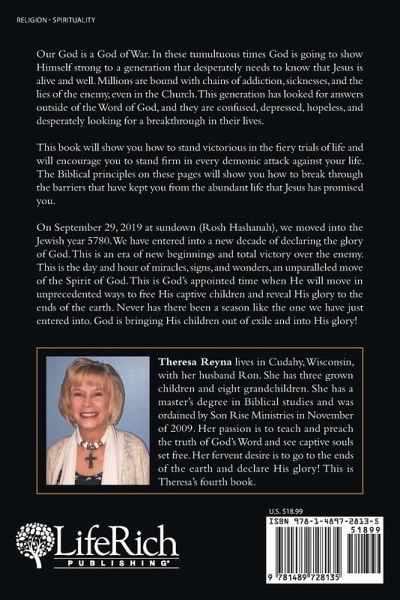 Our God is a God of War. In these tumultuous times God is going to show Himself strong to a generation that desperately needs to know that Jesus is alive and well. Millions are bound with chains of addiction, sicknesses, and the lies of the enemy, even in the Church. This generation has looked for answers outside of the Word of God, and they are confused, depressed, hopeless, and desperately looking for a breakthrough in their lives. This book will show you how to stand victorious in the fiery trials of life and will encourage you to stand firm in every demonic attack against your life. The Biblical principles on these pages will show you how to break through the barriers that have kept you from the abundant life that Jesus has promised you. On September 29, 2019 at sundown (Rosh Hashanah), we moved into the Jewish year 5780. We have entered into a new decade of declaring the glory of God. This is an era of new beginnings and total victory over the enemy. This is the day and hour of miracles, signs, and wonders, an unparalleled move of the Spirit of God. This is God's appointed time when He will move in unprecedented ways to free His captive children and reveal His glory to the ends of the earth. Never has there been a season like the one we have just entered into. God is bringing His children out of exile and into His glory!