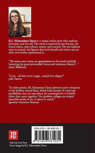 I am a visual artist who uses a variety of media to explore feminist themes and the self. My approach to both art and poetry is the same; collage. I find images or words I am innately attracted to, cut them out, arranging and rearranging until I find the perfect picture. I am heavily influenced by the found object; discarded magazines, the sky in a piece of junk mail, the still frame of a paused movie, the shape of a scrap of paper, any likeness or shape that calls to me. I consider the images of prehistoric goddess figurines, paramount and central to my own art, as a found object; Something someone was compelled to create that was lost or discarded, then found again. My poems are inspired by the found word; fortune cookies, passing billboards, my teenage diaries, made up and mis-heard songs, overheard conversations, grocery lists, and all other manner of words heard or seen in serendipitous encounters. I use collage to create a sacred space for these images and words, ancient and new. I feed myself found words and images; digesting, reconstructing, honoring form and phrase, creating a sacred place for each, and then gluing every one down in its rightful place.