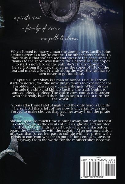 A pirate crew. A family of sirens. One path to choose. When forced to marry a man she doesn't love, Lucille joins a pirate crew as a boy to escape. The other secret she has to face daily is that she can see and speak to the dead, and all thanks to the ghost who haunts the Charmaine. She hopes to start a new life on the path she's finally chosen for herself. Along the way, she learns the ropes of life on the sea and makes a few friends along the way. She just has to learn never to get too close. Captain Oliver Shaw is a man of honor. Lucille Farrow starts to notice, too. She unwillingly wants to experience the forbidden romance every chance she gets. When pirates invade the ship and kidnap Lucille, the truth begins to unravel piece by piece. The entire crew comes to discover who she really is, and then things begin to take a turn for the worst. Sirens attack one fateful night and the only hero is Lucille herself. All that's left of her now is uncertainty as she's forced to make choices that lead her away from the pirate life. She has spent so much time running away, but now her past is catching up. As the events of curses, ghosts, and murder unfold, Lucille finds herself back where she started-on board the Charmaine with the captain. After getting a vision of a war that forces her past to collide with her present, she needs to confront what she's put off long enough. Love, or hiding away from the world for the monster she's become.