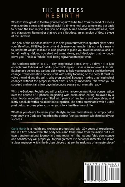 Wouldn't it be great to feel like yourself again? To be free from the load of excess waste, undue stress, and spiritual lack? It's time to heal your temple and get back to or find the God in you. The you no longer buried beneath unhealthiness, hurt and stagnation. Remember that you are a Goddess, an extension of God, a piece of the universe. The goal of the Goddess Rebirth is to help you resurrect your spiritual glow, detox your life of bad INNERgy (energy) and cleanse your temple. It is not only a means to jumpstart weight loss but is also geared to guide you towards spiritual and internal healing. Helping you shed old ways, views, and ideologies that no longer serve you. This is a "Whole" well-being rejuvenation experience. The Goddess Rebirth is a 21- day progressive detox. Why 21 days? It is just enough time to break old habits, poor thinking and usher in an improved lifestyle. Each phase delves into various daily topics to help you establish a positive inward change. Transformation cannot start with solely focusing on the body. It must involve the mind and the spirit. Why progressive? Because making drastic physical changes without the proper internal shift is nearly impossible. We want you to succeed and not fail a few days in because you are not mentally ready. With the Goddess Rebirth, you will gradually change your nutritional consumption over the course of 3 phases; beginning with basic clean eating, followed by a clean foods vegetarian plan filled with plenty of raw fruits and vegetables, and lastly conclude with a no solid foods regimen. The detox culminates with a 3-day post detox recovery plan to usher you into a healthier way of life. Whether you desire to renew your lifestyle, recover from illness, or simply detox your body, the Goddess Rebirth is the perfect foundation from which to build your success.