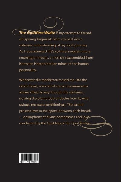 The Goddess Waltz is my attempt to thread whispering fragments from my past into a cohesive understanding of my soul's journey. As I reconstructed life's spiritual nuggets into a meaningful mosaic, a memoir reassembled from Hermann Hesse's broken mirror of the human personality. Whenever the maelstrom tossed me into the devil's heart, a kernel of conscious awareness always sifted its way through the darkness, slowing the plumb bob of desire from its wild swings into past conditionings. The sacred present lives in the space between each breath ... a symphony of divine compassion and love conducted by the Goddess of the Cool Breeze.