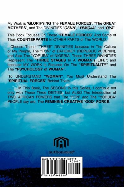 My Work is 'GLORIFYING The FEMALE FORCES'; "The GREAT MOTHERS", and The DIVINITIES "OSUN", "YEMOJA", and "OYA". This Book Focuses On These "FEMALE FORCES" And Some of Their COUNTERPARTS In OTHER PARTS of The WORLD. I Choose These "THREE" DIVINITIES because in The Culture of My People, The "FON" of DAHOMEY (REPUBLIC of BENIN), and Also The "YORUBA" of NIGERIA, These THREE DIVINITIES Represent The "THREE STAGES In A WOMAN's LIFE"; and because MY WORK is Focused On The "SPIRITUALITY" and The "PSYCHOLOGY of WOMAN". 'To UNDERSTAND "WOMAN", You Must Understand The "SPIRITUAL FORCES" Behind Them.' ...In This Book, The SECOND in this Series, I continue not only with These Three DEITIES, but ALSO The Introduction of TWO AFRICAN POWERS that The "FON" and The "YORUBA" PEOPLE say are, The FEMININE CREATIVE "GOD" FORCE.