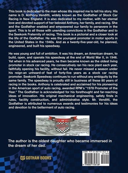 This book is dedicated to the man whose life inspired me to tell his story. His name is D. Anthony Venditti, widely known as the Godfather of Stock Car Racing in New England. It is also dedicated to my mother, with her eternal love and devoted support of her beloved Anthony, her family, and racing. She and the Godfather enabled and empowered our family to persevere in the sport. This is to all those with unending convictions in the Godfather and to the Seekonk Fraternity of racing. This book is a pictorial and a closer look at the life of the Godfather. He was the youngest promoter in motor sports in the United States in the 1940s. And as a twenty-five-year-old, he planned, engineered, and built his speedway.He was young and full of ambition. It was his dream, an American dream, to build, open, and operate his speedway at the end of World War II, in 1946. Yet when in his advanced years, he then became known as the oldest living promoter in stock car racing. He consecutively ran his race plant each year, faithfully opening his facility, without fail. He never missed a season under his reign-an unheard-of feat of forty-five years as a stock car racing promoter. Seekonk Speedway continues to run without any ambiguity by the same family. The speedway is proudly still in business all these 80 years of racing in the books. Anthony is celebrated and acclaimed for his pioneering in the American sport of auto racing, awarded RPM's "1978 Promoter of the Year." The Godfather is acknowledged for his forethought and far-reaching ideas of innovation. His original mechanical engineering, safety firsts in rules, facility construction, and administrative style. Mr. Venditti, the Godfather is attributed to numerous awards and testimonies for his ideas and devotion to the betterment of auto racing.