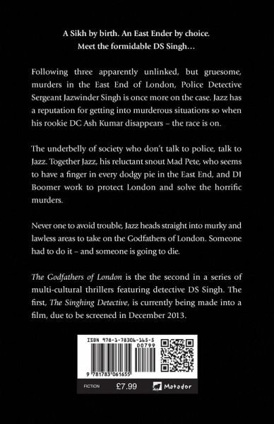A Sikh by birth. An East Ender by choice. Meet the formidable DS Singh. Following three apparently unlinked, but gruesome, murders in the East End of London, Police Detective Sergeant Jazwinder Singh is once more on the case. Jazz has a reputation for getting into murderous situations so when his rookie DC Ash Kumar disappears - the race is on. The underbelly of society who don't talk to police, talk to Jazz. Together Jazz, his reluctant snout Mad Pete, who seems to have a finger in every dodgy pie in the East End, and DI Boomer work to protect London and solve the horrific murders. Never one to avoid trouble, Jazz heads straight into murky and lawless areas to take on the Godfathers of London. Someone had to do it - and someone is going to die. The Godfathers of London is the the second in a series of multi-cultural thrillers featuring detective DS Singh. The first, The Singhing Detective, is currently being made into a film, due to be screened in December 2013