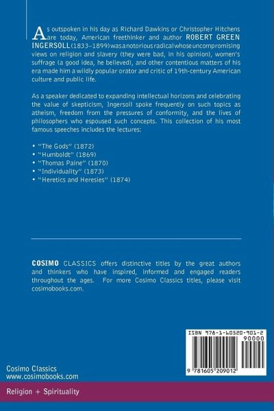 As outspoken in his day as Richard Dawkins or Christopher Hitchens are today, American freethinker and author ROBERT GREEN INGERSOLL (1833-1899) was a notorious radical whose uncompromising views on religion and slavery (they were bad, in his opinion), women's suffrage (a good idea, he believed), and other contentious matters of his era made him a wildly popular orator and critic of 19th-century American culture and public life. As a speaker dedicated to expanding intellectual horizons and celebrating the value of skepticism, Ingersoll spoke frequently on such topics as atheism, freedom from the pressures of conformity, and the lives of philosophers who espoused such concepts. This collection of his most famous speeches includes the lectures: ¿ "The Gods" (1872) ¿ "Humboldt" (1869) ¿ "Thomas Paine" (1870) ¿ "Individuality" (1873) ¿ "Heretics and Heresies" (1874)