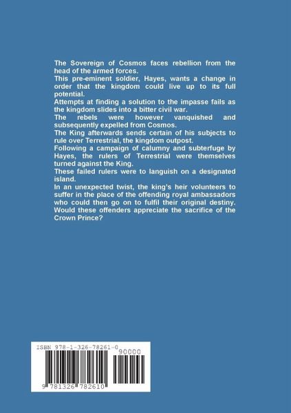The Sovereign of Cosmos faces rebellion from the head of the armed forces. This pre-eminent soldier, Hayes, wants a change in order that the kingdom could live up to its full potential. Attempts at finding a solution to the impasse fails as the kingdom slides into a bitter civil war. The rebels were however vanquished and subsequently expelled from Cosmos. The King afterwards sends certain of his subjects to rule over Terrestrial, the kingdom outpost. Following a campaign of calumny and subterfuge by Hayes, the rulers of Terrestrial were themselves turned against the King. These failed rulers were to languish on a designated island. In an unexpected twist, the king's heir volunteers to suffer in the place of the offending royal ambassadors who could then go on to fulfil their original destiny. Would these offenders appreciate the sacrifice of the Crown Prince?