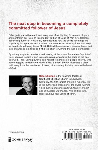 The next step in becoming a completely committed follower of Jesus False gods war within each and every one of us, fighting for a place of glory and control in our lives. In this student edition of gods at war, Kyle Idleman, bestselling author of not a fan, demonstrates how the desire for things like popularity, acceptance, and success can become modern-day idols that keep us from truly following Jesus Christ. Behind the everyday pressures, fears, and lack of purpose is a false god who too often is winning the war in our hearts. By asking insightful questions and looking at the issues from a teen's point of view, Idleman reveals which false gods most often take the place of the one true God. Then, using powerful and honest testimonies of people like you who have struggled in each area, gods at war student edition illustrates a clear path away from the heartache of 21st-century idolatry back to the heart of God.