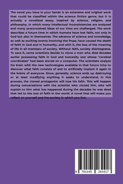 The novel you have in your hands is an extensive and original work that could be classified within the science fiction genre, but it is actually a novelized essay, inspired by science, religion, and philosophy, in which many intellectual inconsistencies are analyzed and many preconceived ideas of our time are challenged. The work describes a future time in which humans have lost faith, not only in God but also in themselves. The advance of science and knowledge, as well as exciting events involving the Pope, have caused the death of faith in God and in humanity, and with it, the loss of the meaning of life in all members of society. Without faith, society disintegrates. To save it, some scientists decide to clone a man who died decades earlier possessing faith in God and humanity and whose "cerebral coordinates" had been stored on a computer. The scientists analyze his brain with the new technologies available in that future time to discover what faith consists of and to artificially implant it again in the brains of everyone. Since, generally, science ends up destroying or at least modifying anything it seeks to understand, in this process, the cloned protagonist will lose his faith. This will happen during conversations with the scientist who cloned him, who will explain to him what has happened during the decades he was dead that led to the loss of faith in the world. A novel that will make you reflect on yourself and the society in which you live.