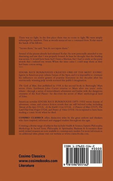 There was no fight. In the first place there was no room to fight. We were simply submerged by numbers. Then as swords menaced me a command from Xodar stayed the hands of his fellows. "Secure them," he said, "but do not injure them." Several of the pirates already had released Xodar. He now personally attended to my disarming and saw that I was properly bound. At least he thought that the binding was secure. It would have been had I been a Martian, but I had to smile at the puny strands that confined my wrists. When the time came I could snap them as they had been cotton string. ~~~ Edgar Rice Burroughs created one of the most iconic figures in American pop culture, Tarzan of the Apes, and it is impossible to overstate his influence on entire genres of popular literature in the decades after his enormously winning pulp novels stormed the public's imagination. The Gods of Mars, first published in 1918, is the second book in Burroughs' Mars series. Here, Earthman John Carter returns to Mars after ten years' exile, where-through a series of extraordinary adventures and battles with the dangerous creatures of the Red Planet-he discovers the secret of Mars' mythological land of Eden. American novelist EDGAR RICE BURROUGHS (1875-1950) wrote dozens of adventure, crime, and science fiction novels that are still beloved today, including Tarzan of the Apes (1912), At the Earth's Core (1914), A Princess of Mars (1917), The Land That Time Forgot (1924), and Pirates of Venus (1934). He is reputed to have been reading a comic book when he died.