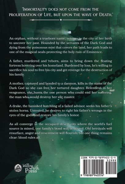 An orphan, without a trueborn name, returns to the city of her birth to uncover her past. Hounded by the servants of the Dark God and dying from the poisonous mist that covers the land, her path leads to one of the magical seals protecting the holy ruin of Eminence. A father, murdered and reborn, aims to bring down the floating fortress hovering over his homeland. Burdened by loss, he's willing to sacrifice his soul to free his city and get revenge for the destruction of his family. A mother, captured and bonded to a daemon, kills in the name of the Dark God so she can free her tortured daughter. Relentless in her vengeance, she hunts the one person who could end her suffering: the man who would destroy her vile master. A drake, the banished hatchling of a failed advisor, seeks his father's stolen horns. Untested, he desires to right his father's wrongs in the eyes of the gods and restore his family's honor. As all converge in the occupied desert city where the world's fuel source is mined, one family's bond will be tested. Old betrayals will resurface, anger and resentment will flourish, but one thing remains clear: blood rules all.