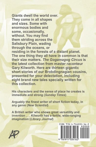 Giants dwell the world over. They come in all shapes and sizes. Some with enormous bodies and some, occasionally, without. You may find them striding across the Salisbury Plain, wading through the oceans, or residing in the forests of a distant planet. The one thing they all have in common is that their size matters. The Gogamagog Circus is the latest collection from master raconteur Gary Kilworth. Here are thirteen gigantic short stories of our Brobdingnagian cousins, presented for your delectation, including eight brand new tales specially written for this collection. His characters and the sense of place he creates is immediate and strong (Sunday Times) Arguably the finest writer of short fiction today, in any genre (New Scientist) A British writer who shows great versatility and invention . . . Kilworth has a fertile, wide-ranging imagination (Library Journal) ¿¿Kilworth is a master of his trade. (Punch Magazine) A convincing display of fine talent. (The Times)