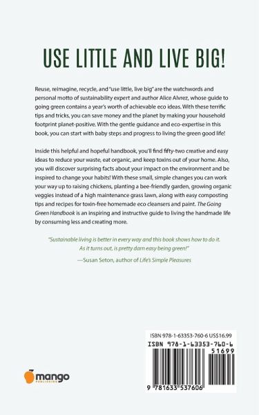 Easy, healthy, money-saving DIY ideas for a sustainable lifestyle Inspired living for the environment: Make your footprint planet-positive. With the gentle guidance of eco-expert, Alice Mary Alvrez, you can start with baby steps and progress to living the green good life! Level up your eco-knowledge with these 52 creative ideas and easy ways to reduce your waste, eat organic, and keep toxins out of your home. Grow organic, reduce waste, live toxin-free, and save money: Inside this helpful and hopeful guide, you'll find tips for greening up all the areas of your life. Learn surprising facts about your impact on the environment and change your habits with do-it-yourself ideas. Start with small, simple changes and work your way up to raising chickens, planting a bee-friendly garden, and growing organic veggies instead of a high maintenance grass lawn. Also find easy composting tips and recipes for toxin-free homemade eco cleansers and paint. A DIY handbook for all levels: Whether you want to be a green rookie or an eco-master, you can help the planet every week of the year. The Going Green Handbook is an inspiring and instructive guide to living the handmade life by consuming less and creating more. Use little, live big! Readers will learn: * why we live the way we do and how we can become less wasteful and greener * tips, tricks and secrets for a self-sufficient sustainable home and lifestyle * starter garden tips for growing your own healthy food, fruit, veggies, and fresh herbs * how to save money by going green Save money, be inspired, and go green with this helpful and easy handbook!