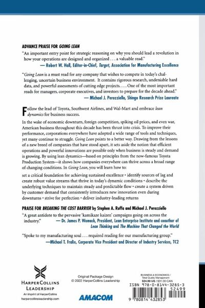 Efficient operations and powerful innovations are not limited to seasons of growth and high demand. Going Lean introduces the powerful yet unexpected mind-set that's reshaping the rules for business competitiveness: Lean Dynamics (TM). This approach, based on the now-famous Toyota Production System--empowers companies to thrive in virtually any environment--even when sudden shifts occur or they experience unpredictable conditions. Through a detailed exploration of this approach, readers will learn how to: become broadly effective in creating and sustaining value; set a critical foundation for achieving sustained excellence; identify sources of lag and create robust value streams that thrive in today's dynamic conditions; describe the underlying techniques to maintain steady and predictable flow; create a system based on "pull," or external demand that consistently introduces new innovation; strive for perfection; and deliver industry-leading returns. Led by a new breed of companies--Toyota, Walmart, and Southwest Airlines--this innovative mind-set changes the game for businesses everywhere. Going Lean teaches readers how their companies--big or small--can leverage this revolutionary thinking to measure and achieve real results.