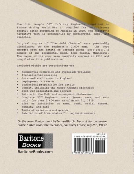 At the end of World War I, shortly after returning to the U.S., the 53rd Regiment recorded its history in a long-forgotten narrative document that included an extensive collection of photographs, maps, and sketches. This book is a digital reproduction of their work. Included within are descriptions of: Regimental formation and stateside training ** Transatlantic crossing ** Intermediate bivouac in England ** Deployment in France ** Logistical preparation for battle ** Combat, including the Meuse-Argonne offensive ** Post-war occupation and service ** Return to the U.S. and subsequent disbandment ** Complete 53rd Regiment roster (name, rank, and sub-unit) for over 2,600 men as of March 31, 1919 ** List of casualties by name, rank, serial number, company, and date ** Texts of citations and awards ** Tabulation of home states for regiment members.