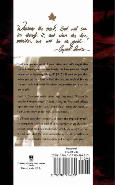 Written by popular Christian singer Crystal Lewis, this devotional book reflects upon the songs on her album, Gold--songs that speak of God's faithfulness in the midst of hard times.