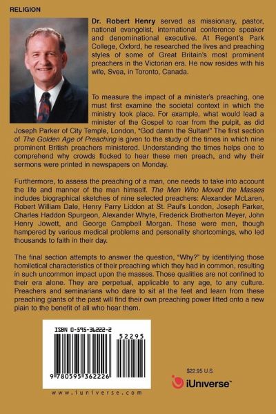 To measure the impact of a minister's preaching, one must first examine the societal context in which the ministry took place. For example, what would lead a minister of the Gospel to roar from the pulpit, as did Joseph Parker of City Temple, London, 'God damn the Sultan!" The first section of The Golden Age of Preaching is given to the study of the times in which nine prominent British preachers ministered. Understanding the times helps one to comprehend why crowds flocked to hear these men preach, and why their sermons were printed in newspapers on Monday. Furthermore, to assess the preaching of a man, one needs to take into account the life and manner of the man himself. The Men Who Moved the Masses includes biographical sketches of nine selected preachers: Alexander McLaren, Robert William Dale, Henry Parry Liddon at St. Paul's London, Joseph Parker, Charles Haddon Spurgeon, Alexander Whyte, Frederick Brotherton Meyer, John Henry Jowett, and George Campbell Morgan. These were men, though hampered by various medical problems and personality shortcomings, who led thousands to faith in their day. The final section attempts to answer the question, 'Why?" by identifying those homiletical characteristics of their preaching which they had in common, resulting in such uncommon impact upon the masses. Those qualities are not confined to their era alone. They are perpetual, applicable to any age, to any culture. Preachers and seminarians who dare to sit at the feet and learn from these preaching giants of the past will find their own preaching power lifted onto a new plain to the benefit of all who hear them.