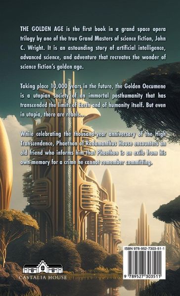 THE GOLDEN AGE is the first book in a grand space opera trilogy by one of the true Grand Masters of science fiction, John C. Wright. It is an astounding story of artificial intelligence, advanced science, and adventure that recreates the wonder of science fiction's golden age. Taking place 10,000 years in the future, the Golden Oecumene is a utopian society of an immortal posthumanity that has transcended the limits of Earth and of humanity itself. But even in utopia, there are rebels... While celebrating the thousand-year anniversary of the High Transcendence, Phaethon of Radamanthus House encounters an old friend who informs him that Phaethon is an exile from his own memory for a crime he cannot remember committing.