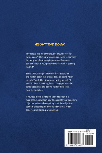 "I don't love this job anymore, but should I stay for the pension?" This gut-wrenching question is common for many people working in pensionable careers. But how much is your pension worth? And, is staying worth it? Since 2017, Grumpus Maximus has researched and written about this critical decision point, which he calls The Golden Albatross. Having served 20 years in the U.S. Military, he too struggled with the same questions, and now he helps others learn from his mistakes. If your job offers a pension, then this book is a must-read. Easily learn how to calculate your pension's objective value and weigh it against the subjective benefits of leaving for more fulfilling work. When done, you will agree, it was worth it.