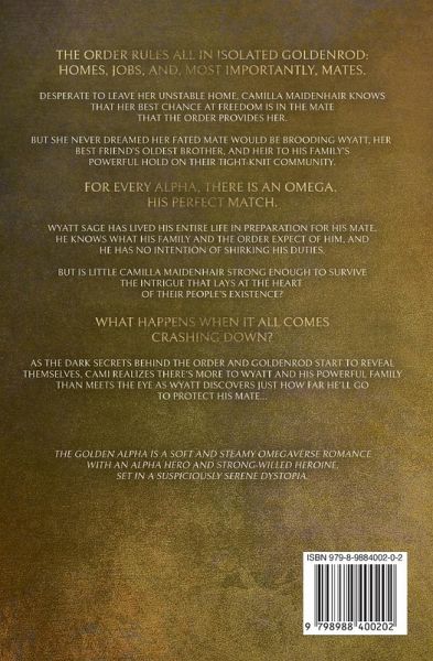 The Order rules all in isolated Goldenrod: homes, jobs, and, most importantly, mates. Desperate to leave her unstable home, Camilla Maidenhair knows that her best chance at freedom is in the mate that the Order provides her. But she never dreamed her fated mate would be brooding Wyatt, her best friend's oldest brother, and heir to his family's powerful hold on their tight-knit community. For every alpha, there is an omega. His perfect match. Wyatt Sage has lived his entire life in preparation for his mate. He knows what his family and The Order expect of him, and he has no intention of shirking his duties. But is little Camilla Maidenhair strong enough to survive the intrigue that lays at the heart of their people's existence? What happens when it all comes crashing down? As the dark secrets behind the Order and Goldenrod start to reveal themselves, Cami realizes there's more to Wyatt and his powerful family than meets the eye as Wyatt discovers just how far he'll go to protect his mate.... The Golden Alpha is a soft and steamy omegaverse romance with an alpha hero and strong-willed heroine, set in a suspiciously serene dystopia.