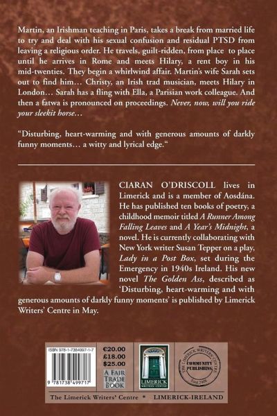 "The Golden Ass" weaves together several storylines and characters. The main character Martin, an Irishman teaching in Paris, takes a sabbatical from marriage and family life to confront his demons of sexual confusion and PTSD arising from his period as a monk. Guilt-ridden, pursued by rumours of criminality, he travels through Europe to Rome, where he meets Hilary, an angelic rent boy in his twenties. They begin a whirlwind affair. Martin's wife, Sarah, goes in search of him."The Golden Ass" it alludes to the ancient Roman novel of the same name which was the story of a man turned into a donkey. Similarly in O'Driscoll's work the protagonist undergoes personal and psychological transformation. Early reviews of the novella has described it as "Disturbing, heart-warming and with generous amounts of darkly funny moments."