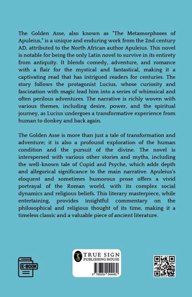 ""The Golden Ass,"" also known as ""Metamorphoses,"" is a classic Roman novel written by the ancient writer Apuleius. The narrative follows the misadventures of Lucius, a curious and reckless young man who becomes transformed into a donkey after dabbling in magic. As a donkey, Lucius embarks on a series of comical and fantastical escapades, encountering a diverse cast of characters and witnessing bizarre and often humorous events. Through Lucius's journey, Apuleius weaves a tapestry of themes including the pursuit of knowledge, the consequences of desire, and the transformative power of love. Rich in vivid imagery, satire, and allegory, ""The Golden Ass"" offers a window into the vibrant tapestry of Roman society and the human condition. With its enduring appeal and timeless insights, the novel continues to captivate readers across centuries, solidifying its place as a masterpiece of classical literature.