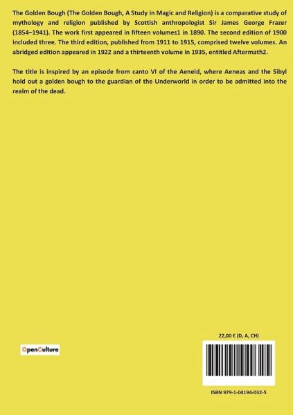 The Golden Bough (The Golden Bough, A Study in Magic and Religion) is a comparative study of mythology and religion published by Scottish anthropologist Sir James George Frazer (1854¿1941). The work first appeared in fifteen volumes1 in 1890. The second edition of 1900 included three. The third edition, published from 1911 to 1915, comprised twelve volumes. An abridged edition appeared in 1922 and a thirteenth volume in 1935, entitled Aftermath2. The title is inspired by an episode from canto VI of the Aeneid, where Aeneas and the Sibyl hold out a golden bough to the guardian of the Underworld in order to be admitted into the realm of the dead.