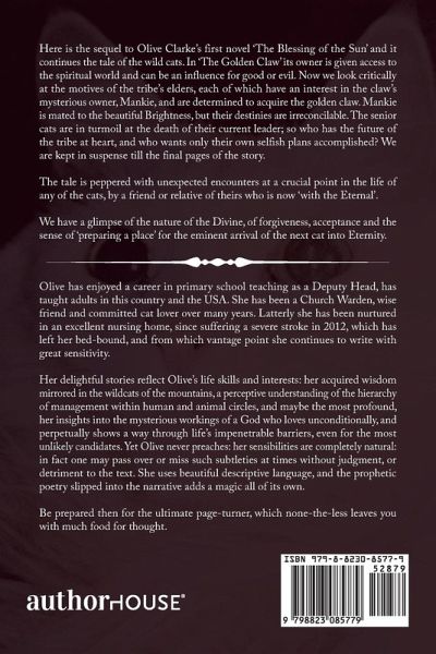 Here is the sequel to Olive Clarke's first novel 'The Blessing of the Sun' and it continues the tale of the wild cats. In 'The Golden Claw' its owner is given access to the spiritual world and can be an influence for good or evil. Now we look critically at the motives of the tribe's elders, each of which have an interest in the claw's mysterious owner, Mankie, and are determined to acquire the golden claw. Mankie is mated to the beautiful Brightness, but their destinies are irreconcilable. The senior cats are in turmoil at the death of their current leader; so who has the future of the tribe at heart, and who wants only their own selfish plans accomplished? We are kept in suspense till the final pages of the story. The tale is peppered with unexpected encounters at a crucial point in the life of any of the cats, by a friend or relative of theirs who is now 'with the Eternal'. We have a glimpse of the nature of the Divine, of forgiveness, acceptance and the sense of 'preparing a place' for the eminent arrival of the next cat into Eternity.
