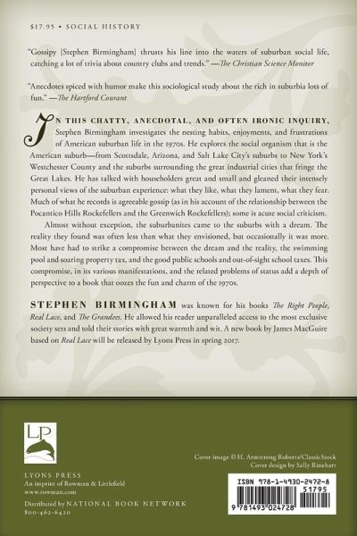 In this chatty, anecdotal, and often ironic inquiry, Stephen Birmingham investigates the nesting habits, enjoyments, and frustrations of American suburban life in the Seventies.
