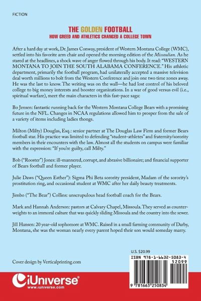 The Golden Football How Greed and Athletics Changed a College Town After a hard day at work, Dr. James Conway, president of Western Montana College (WMC), settled into his favorite arm chair and opened the morning edition of the Missoulian. As he stared at the headlines, a shock wave of anger flowed through his body. It read: "WESTERN MONTANA TO JOIN THE SOUTH ALABAMA CONFERENCE." His athletic department, primarily the football program, had unilaterally accepted a massive television deal worth millions to bolt from the Western Conference and join one two time zones away. He was the last to know. The writing was on the wall-he had lost control of his beloved college to big money interests and booster organizations. In a war of good versus evil (i.e., spiritual warfare), meet the main characters in this fast-pace saga: Bo Jensen: fantastic running back for the Western Montana College Bears with a promising future in the NFL. Changes in NCAA regulations allowed him to prosper from the sale of a variety of items including ladies thongs. Milton (Milty) Douglas, Esq.: senior partner at The Douglas Law Firm and former Bears football star. His practice was limited to defending "student-athletes" and fraternity/sorority members in their encounters with the law. Almost all the students on campus were familiar with the expression: "If you're guilty, call Milty." Bob ("Rooster") Jones: ill-mannered, corrupt, and abrasive billionaire; and financial supporter of Bears football and former player. Queen Esther: Sigma Phi Beta sorority president, Madam of the sorority's prostitution ring, and occasional student at WMC after her daily beauty treatments. Jimbo ("The Bear") Collins: unscrupulous head football coach for the Bears. Mark and Hannah Anderson: pastors at Calvary Chapel, Missoula. They served as counter-weights to an immoral culture that was quickly sliding Missoula and the country into the sewer. Jill Hansen: 20 year-old sophomore at WMC. Raised in a small farming community of Darby, Montana, she was the woman nearly every parent hoped their son would someday marry.