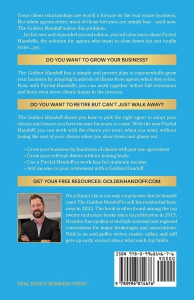 Great client relationships are worth a fortune in the real estate business. But when agents retire, most of those fortunes are simply lost-until now. The Golden Handoff solves this problem. In this new and expanded second edition you will also learn about Partial Handoffs, the solution for agents who want to slow down but not totally retire...yet. Do you want to grow your business? The Golden Handoff has a simple and proven plan to exponentially grow your business by adopting hundreds of clients from agents when they retire. Now, with Partial Handoffs, you can work together before full retirement and keep even more clients happy in the process. Do you want to retire but can't just walk away? The Golden Handoff shows you how to pick the right agent to adopt your clients and ensure you have income for years to come. With the new Partial Handoff, you can work with the clients you want, when you want, without losing the rest of your clients when you slow down and phase out. Grow your business by hundreds of clients with just one agreement Grow your referral clients without buying leads Use a Partial Handoff to work less but maintain income Add income to your retirement with a Golden Handoff