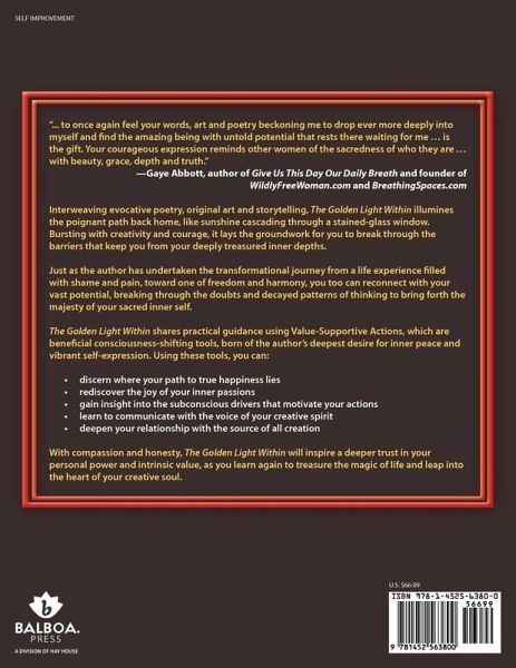 "... to once again feel your words, art, and poetry beckoning me to drop ever more deeply into myself and find the amazing being with untold potential that rests there waiting for me ... is the gift. Your courageous expression reminds other women of the sacredness of who they are ... with beauty, grace, depth and truth." -Gaye Abbott, author of Give Us This Day Our Daily Breath and founder of WildlyFreeWoman.com and BreathingSpaces.com Interweaving evocative poetry, original art, and storytelling, The Golden Light Within illumines the poignant path back home, like sunshine cascading through a stained-glass window. Bursting with creativity and courage, it lays the groundwork for you to break through the barriers that keep you from your deeply treasured inner depths. Just as the author has undertaken the transformational journey from a life experience filled with shame and pain, toward one of freedom and harmony, you too can reconnect with your vast potential, breaking through the doubts and decayed patterns of thinking to bring forth the majesty of your sacred inner self. The Golden Light Within shares practical guidance using value-supportive actions, which are beneficial consciousness-shifting tools, born of the author's deepest desire for inner peace and vibrant self-expression. Using these tools, you can: ¿ discern where your path to true happiness lies ¿ rediscover the joy of your inner passions ¿ gain insight into the subconscious drivers that motivate your actions ¿ learn to communicate with the voice of your creative spirit ¿ deepen your relationship with the source of all creation With compassion and honesty, The Golden Light Within will inspire a deeper trust in your personal power and intrinsic value, as you learn again to treasure the magic of life and leap into the heart of your creative soul.
