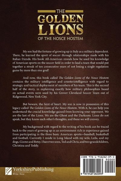 My son had the fortune of growing up in Italy as a military dependent. There, he l earned t he sport of soccer through relationships made with his Italian friends. His book All-American reveals how he used his knowledge of American sports on the soccer eld in order to lead a team that would put together a streak of ten consecutive years of not losing a single regulation game by more than one goal! And now, this book called The Golden Lions of the Nosce Hostem contains the military intelligence and counterintelligence with regard to strategic and tactical deployment of members of his team. This is the second half of the story, in explaining exactly how military philosophies based on actual events were used by his Grover Cleveland Soccer Team out of Ridgewood, New York City.
