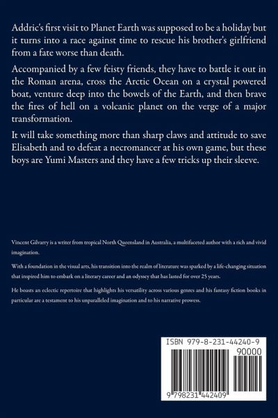 Addric's first visit to Planet Earth was supposed to be a holiday but it turns into a race against time to rescue his brother's girlfriend from a fate worse than death. Accompanied by a few feisty friends, they have to battle it out in the Roman arena, cross the Arctic Ocean on a crystal powered boat, venture deep into the bowels of the Earth, and then brave the fires of hell on a volcanic planet on the verge of a major transformation. It will take something more than sharp claws and attitude to save Elisabeth and to defeat a necromancer at his own game, but these boys are Yumi Masters and they have a few tricks up their sleeve.