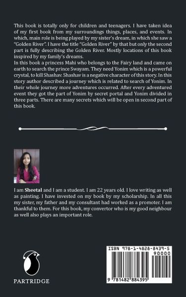 This book is totally only for children and teenagers. I have taken idea of my first book from my surroundings things, places, and events. In which, main role is being played by my sister's dream, in which she saw a "Golden River". I have the title "Golden River" by that but only the second part is fully describing the Golden River. Mostly locations of this book inspired by my family's dreams. In this book a princess Mahi who belongs to the Fairy land and came on earth to search the prince Swayam. They need Yonim which is a powerful crystal, to kill Shashav. Shashav is a negative character of this story. In this story author described a journey which is related to search of Yonim. In their whole journey more adventures occurred. After every adventured event they got the part of Yonim by secret portal and Yonim divided in three parts. There are many secrets which will be open in second part of this book.