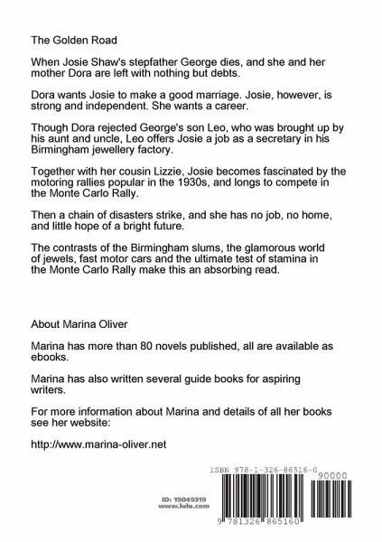The Golden Road When Josie Shaw's stepfather George dies, and she and her mother Dora are left with nothing but debts. Dora wants Josie to make a good marriage. Josie, however, is strong and independent. George's son Leo, offers Josie a job as a secretary in his Birmingham jewellery factory. Together with her cousin Lizzie, Josie becomes fascinated by the motoring rallies popular in the 1930s, and longs to compete in the Monte Carlo Rally. Then a chain of disasters strike, and she has no job, no home, and little hope of a bright future. The contrasts of the Birmingham slums, the glamorous world of jewels, fast motor cars and the ultimate test of stamina in the Monte Carlo Rally make this an absorbing read. About Marina Oliver Marina has more than 80 novels published, all are available as ebooks. Marina has also written several guide books for aspiring writers. For more information about Marina and details of all her books see her website: http://www.marina-oliver.net