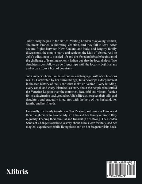 Julia's story begins in the sixties. Visiting London as a young woman, she meets Franco, a charming Venetian, and they fall in love. After several flights between New Zealand and Italy, and lengthy family discussions, the couple marry and settle on the Lido of Venice. And so Julia's adjustment to married life and the Venetian lifestyle begins amid the challenge of learning not only Italian but also the local dialect. Two daughters soon follow, as do friendships with the locals - both Italians and expats from a host of countries. Julia immerses herself in Italian culture and language, with often hilarious results. Captivated by her surroundings, Julia develops a deep interest in the rich history of the islands that make up Venice. Every building, every canal, and every island tells a story about the people who settled the Venetian Lagoon over the countries. Beautiful and vibrant, Venice forms a fascinating background to Julia's life as she raises their bilingual daughters and gradually integrates with the help of her husband, her family, and her friends. Eventually, the family transfers to New Zealand, and now it is Franco and their daughters who have to adjust! Julia and her family return to Italy regularly, keeping their familial and friendship ties strong. The Golden Sands of Change is a tribute, a story about Julia's love for Italy, and her magical experiences while living there and on her frequent visits back.