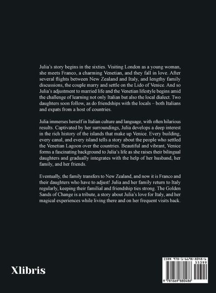 Julia's story begins in the sixties. Visiting London as a young woman, she meets Franco, a charming Venetian, and they fall in love. After several flights between New Zealand and Italy, and lengthy family discussions, the couple marry and settle on the Lido of Venice. And so Julia's adjustment to married life and the Venetian lifestyle begins amid the challenge of learning not only Italian but also the local dialect. Two daughters soon follow, as do friendships with the locals - both Italians and expats from a host of countries. Julia immerses herself in Italian culture and language, with often hilarious results. Captivated by her surroundings, Julia develops a deep interest in the rich history of the islands that make up Venice. Every building, every canal, and every island tells a story about the people who settled the Venetian Lagoon over the countries. Beautiful and vibrant, Venice forms a fascinating background to Julia's life as she raises their bilingual daughters and gradually integrates with the help of her husband, her family, and her friends. Eventually, the family transfers to New Zealand, and now it is Franco and their daughters who have to adjust! Julia and her family return to Italy regularly, keeping their familial and friendship ties strong. The Golden Sands of Change is a tribute, a story about Julia's love for Italy, and her magical experiences while living there and on her frequent visits back.